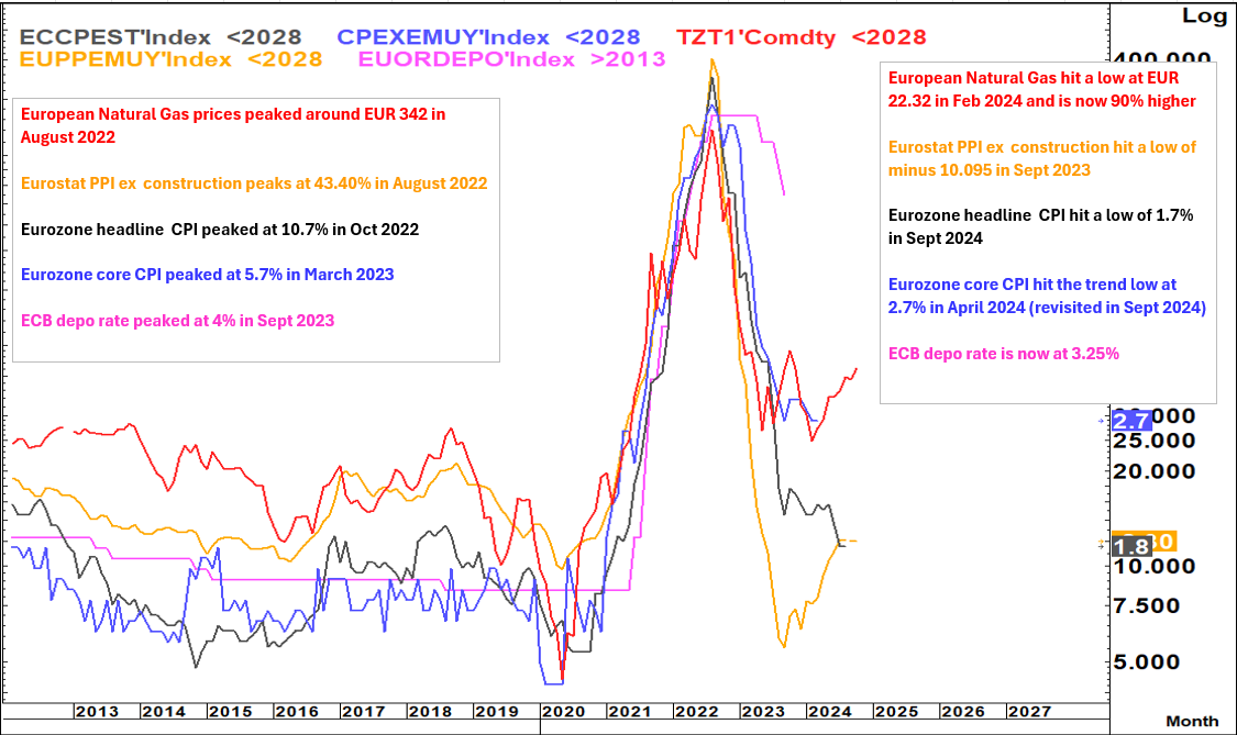 The chart shows the rise in European natural gas prices and its lagged effect through the various inflation indicators as well as the ECB Deposit facility rate.