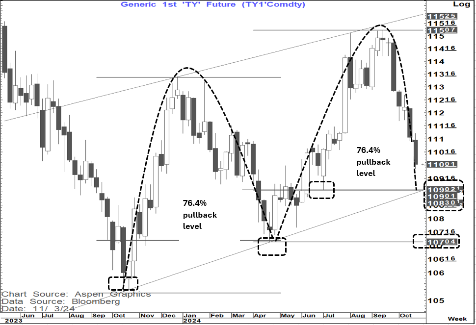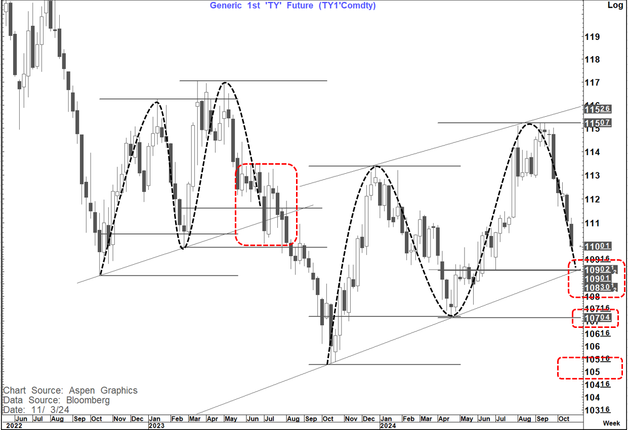 The Bear Case would be that this support area gives way (Weekly close) suggesting that the whole period of price action from October 2023 to now has simply been a big bear flag. In that instance the suggestion would be for at least a test of the April 2024 low at 107. 04/32nds and possibly the Oct 2023 lows around 105 10/32nds.