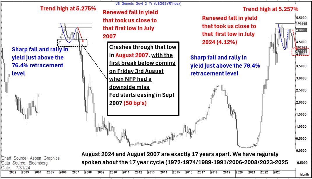 The 4.12% level on the US 2-year yield is the proverbial "Line in the sand" in my view and the chart below only emphasises that.