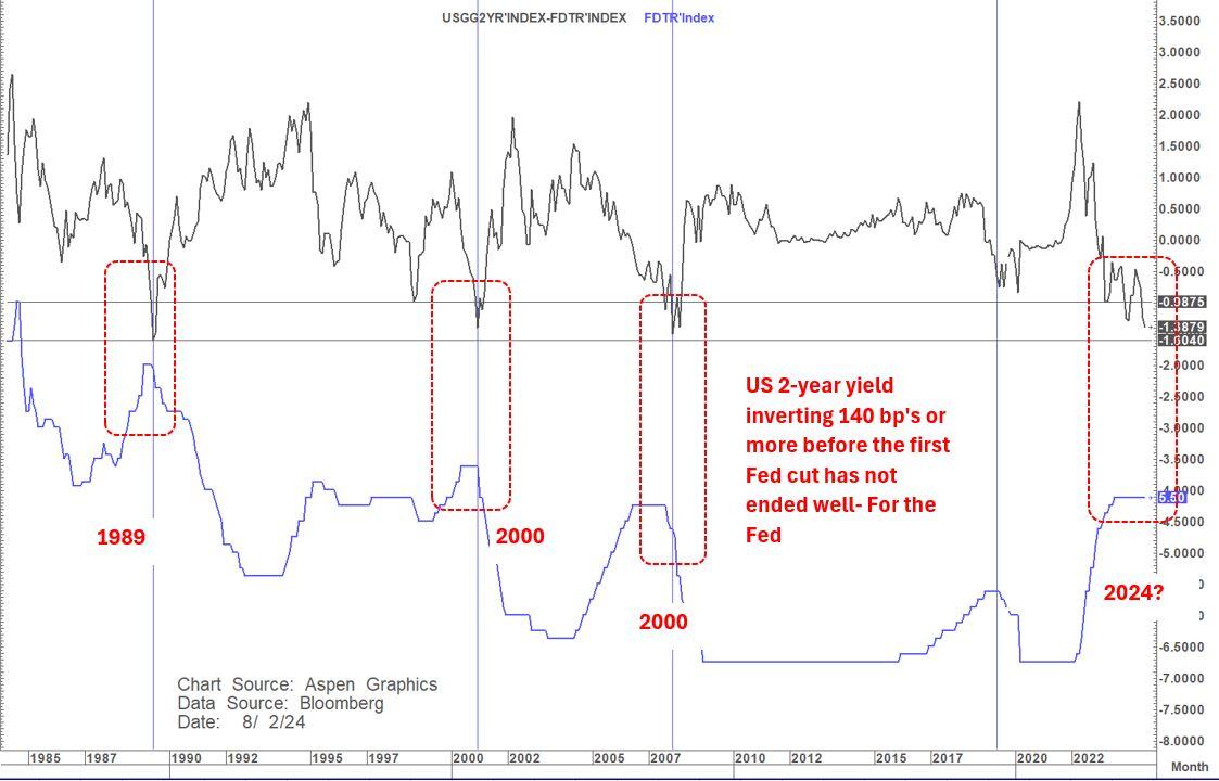 That level of inversion just before the first Fed cut has only occurred 3 times in the last 40 years- in 1989,2000 and 2006 and those periods all ended badly