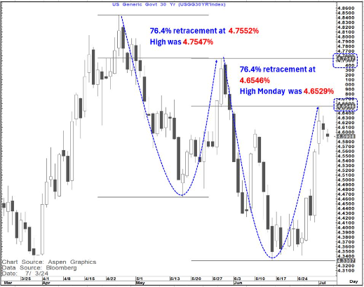 Finally, the double bottom suggested a move to minus 6 bp's compared to the high yesterday at minus 9 (Close enough for Government work) AND we perfectly stopped at the 76.4% pullback level of 4.655% on the 30 -year yield as we did at end May.
