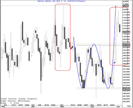 The surge in the US 2's30's curve over the last 2 days following the "Dumpster Debate" seems to have run its course for now.