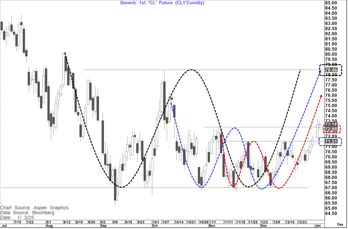 WTI is bid and has already completed a short-term double bottom that suggests a move towards $76. However, it is now above a larger double bottom neckline at $72.88 that suggests (if sustained on a weekly close basis) a move towards $78.50 again. Above there could be a huge double bottom suggesting as high as $90...but that is for another day IF ever.