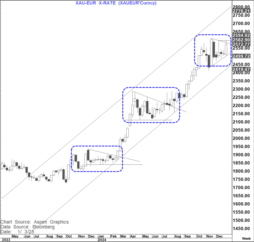 Not surprisingly all of the above results in a very bullish looking Gold-EURO chart. We will have a bullish outside week on a close over EUR 2,535 with a double bottom above EUR 2,595 that would suggest at least EUR 2,700