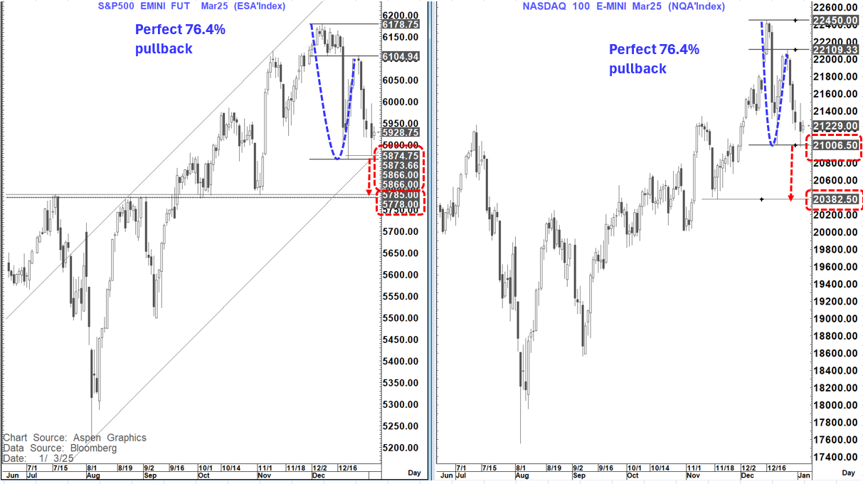 Both ES1 and NQ1 have already tested pivotal short-term supports and held so far. A beak below those levels, if seen, at 5,866-5,875 and 21,006 respectively would suggest another acceleration lower.