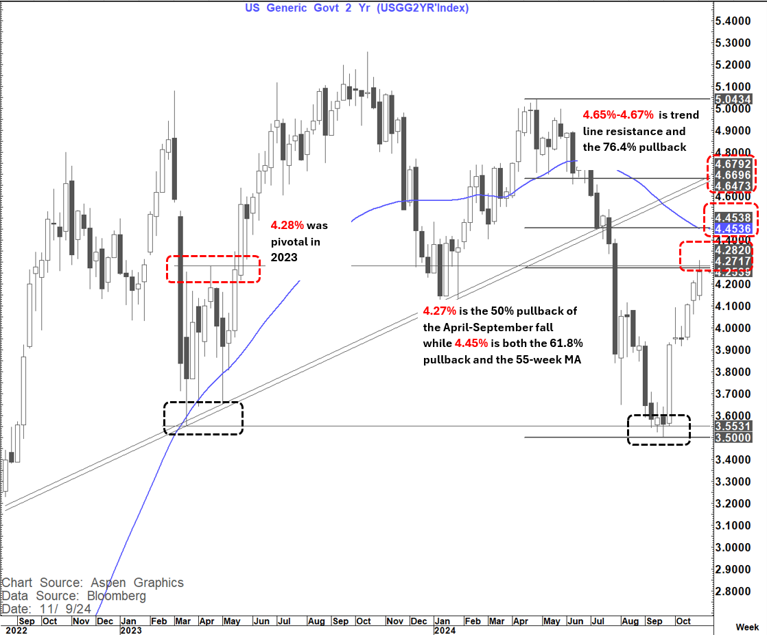 I have, in addition, for some weeks been arguing the danger that the US 2-year yield could head higher with an initial target of 4.27-4.28% (hit and slightly exceeded last week but not with a weekly close above)