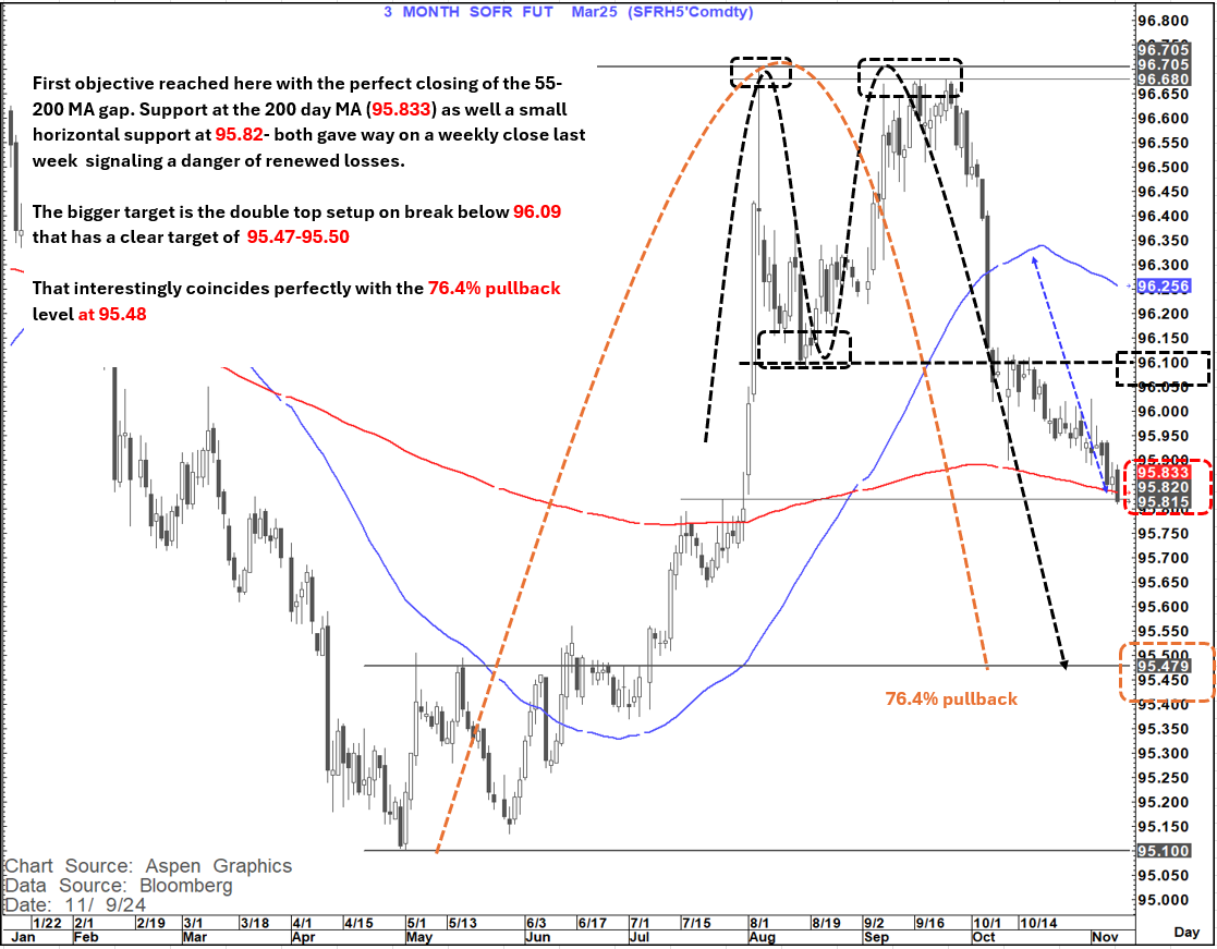 This is the March 2025 SOFR contract and the suggestion here is that there is a real danger that we move towards 95.48 which is about 38 bp's below Friday's close. This would clearly suggest a market adjusting its expectations for the future Fed path.
