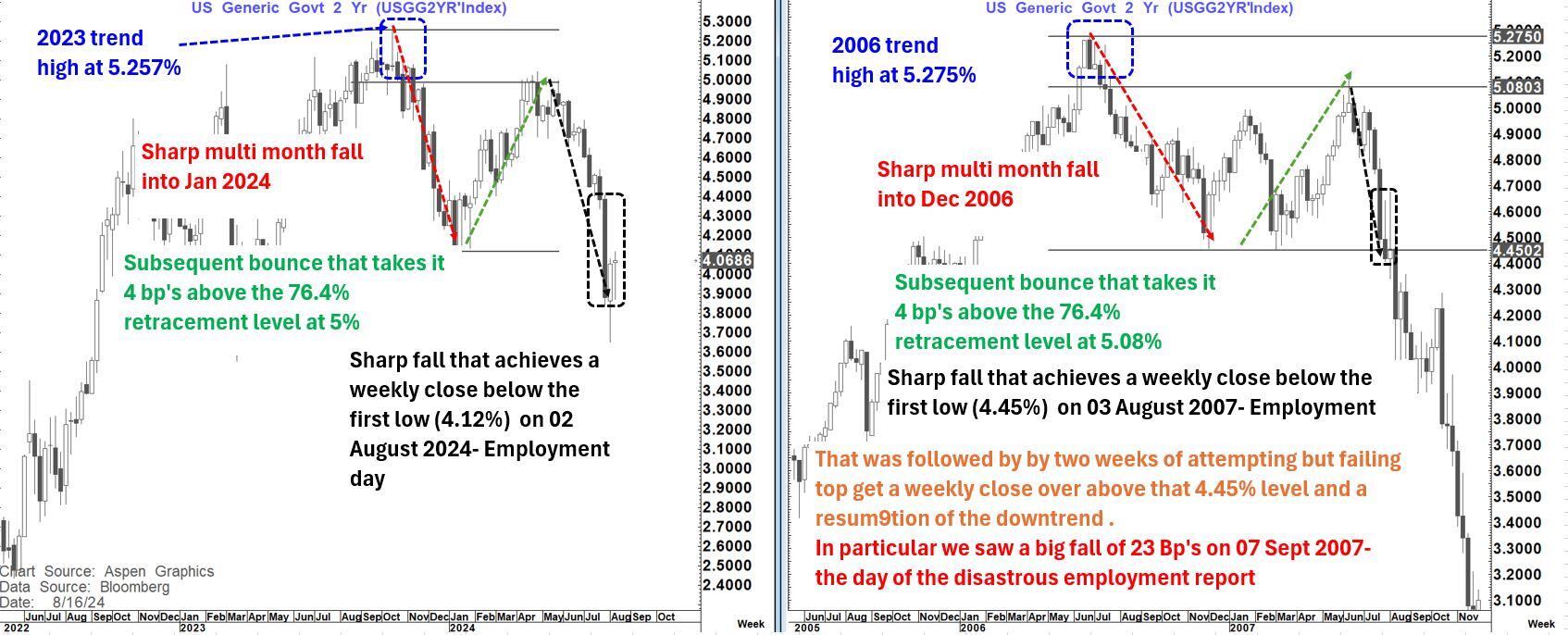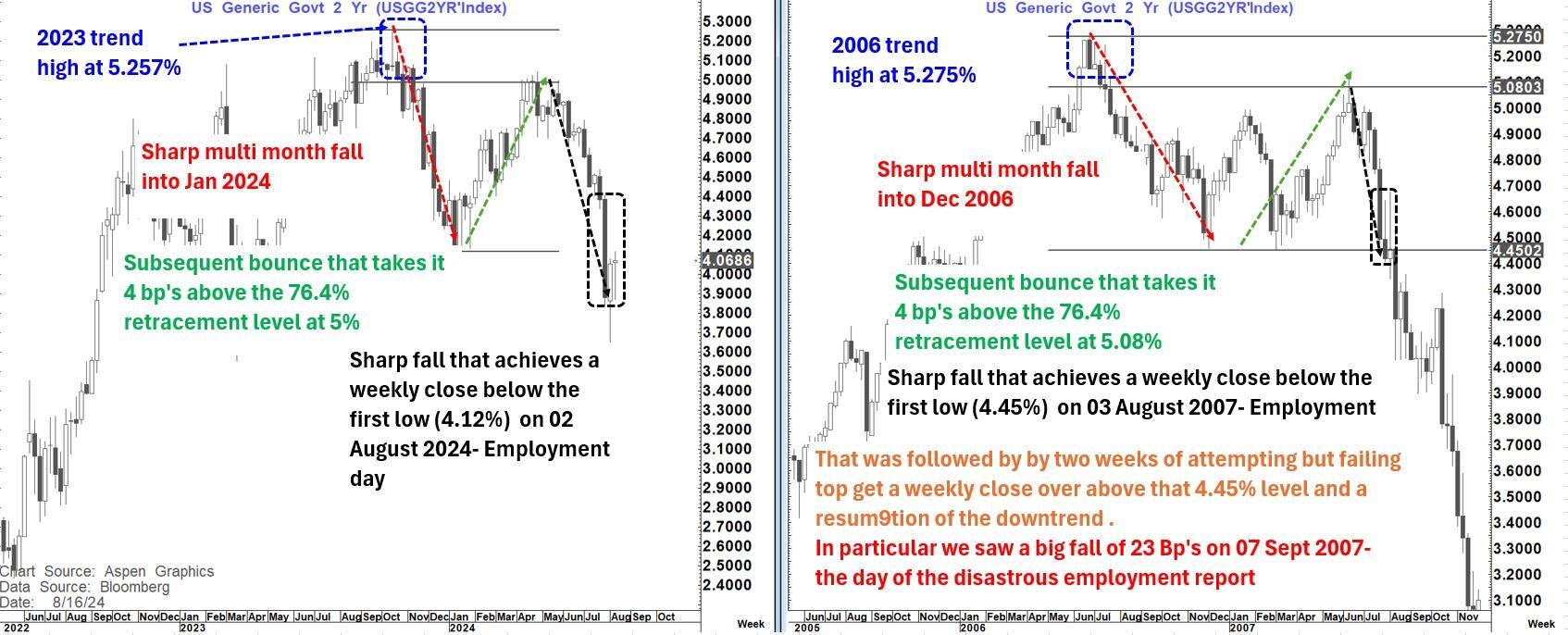 Even with that in mind the similarity in the way the 2-year yield is trading and how it traded in 2007 right down to the Employment Day is astounding as per the chart below.